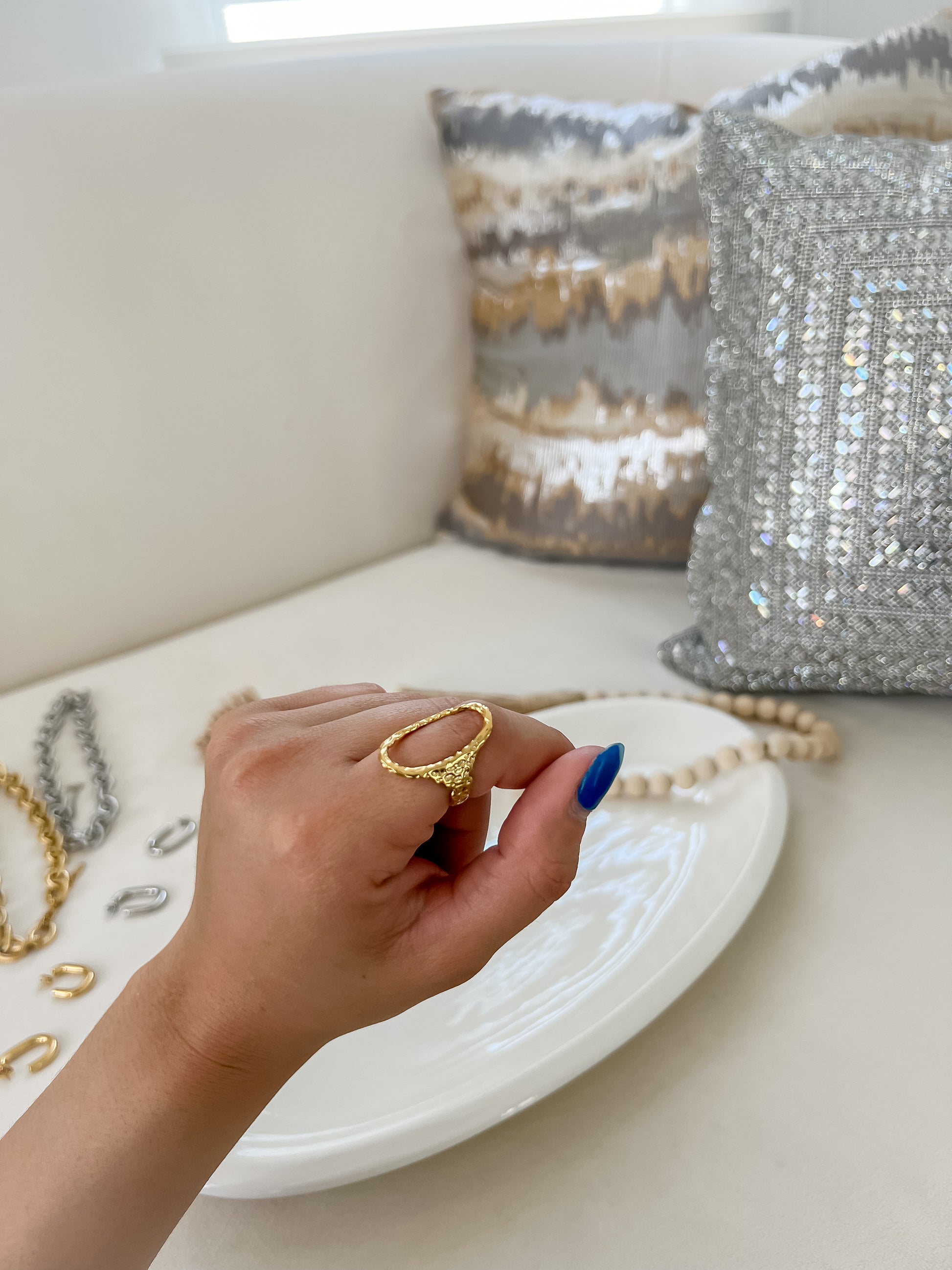 Esta sortija de acero inoxidable dorado destaca por su diseño ovalado abierto. Su forma ajustable permite un fit perfecto para cualquier dedo.